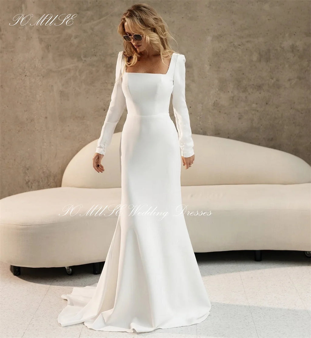 Okouzlující svatební šaty, které spojují nadčasovou eleganci s moderním stylem. Dlouhý splývavý střih působí štíhle a prodlužuje siluetu, zatímco jemné dlouhé rukávy dodávají šatům romantický a sofistikovaný charakter. Lehký materiál a precizní zpracování zaručují pohodlí i dokonalý vzhled po celý svatební den.